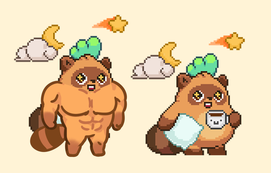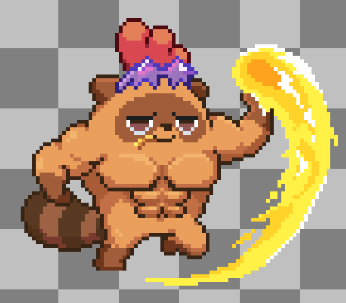 "Buff Moki" started as a joke. We asked, "What if we just stuck a buff body directly onto the sprites?" We cackled with laughter. However, knowing we had 8,888 Mokis, we realized that by making a single set of "Buff Moki" body sprites, we could solve the problem of having a transformed version for every character without making 8,888 individual assets. Huzzah!
