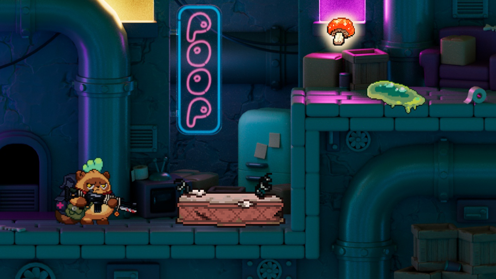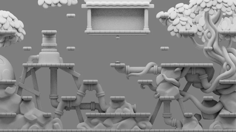 Backgrounds: After the initial tests, I knew the Pixel + CG combo was a hit. While assets Pixel assets were being built and backgrounnd was being designed, I did a lot of compositing and color grading to ensure that—separate from form—the game was easy to read and the user knew where to look.