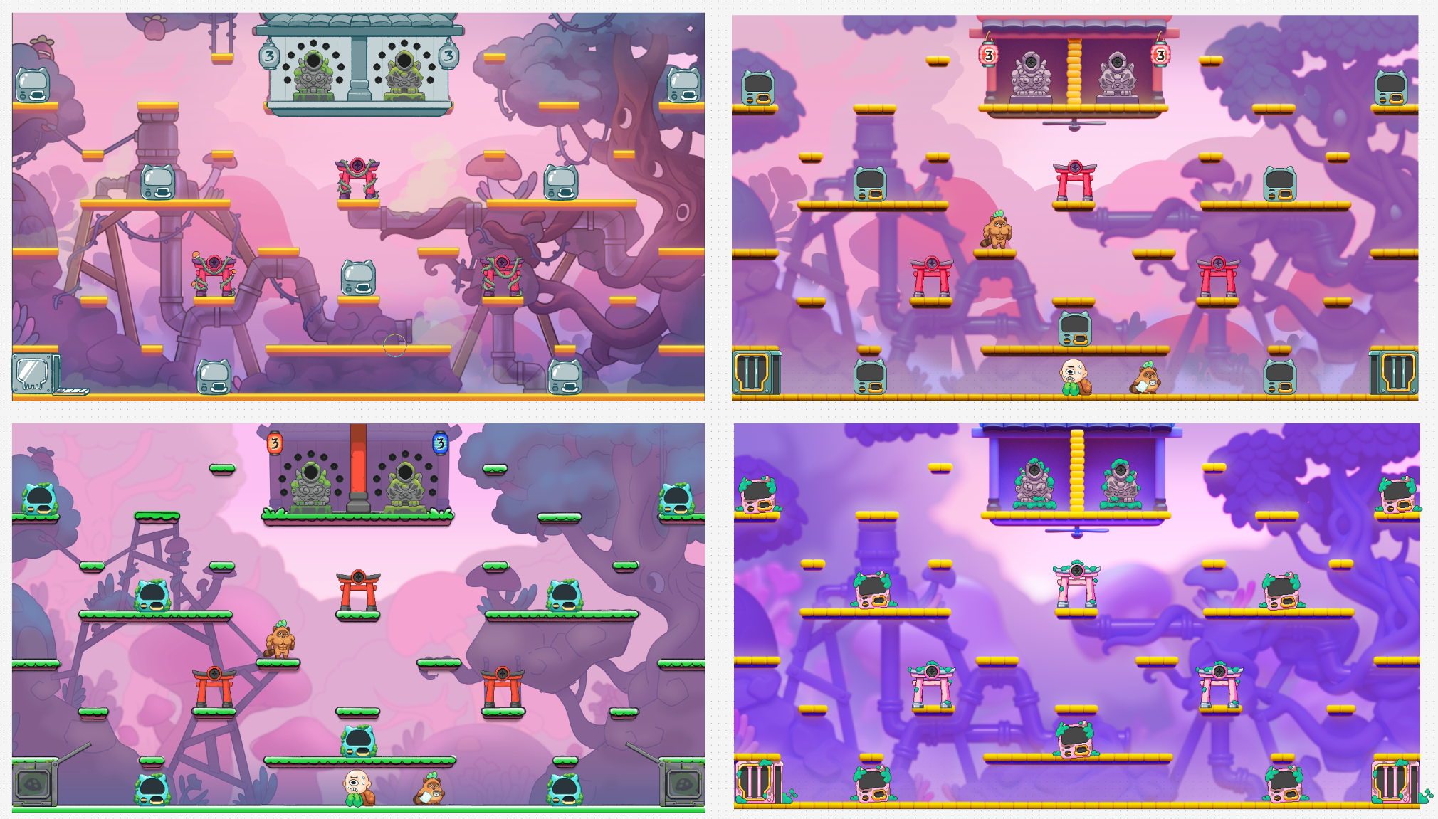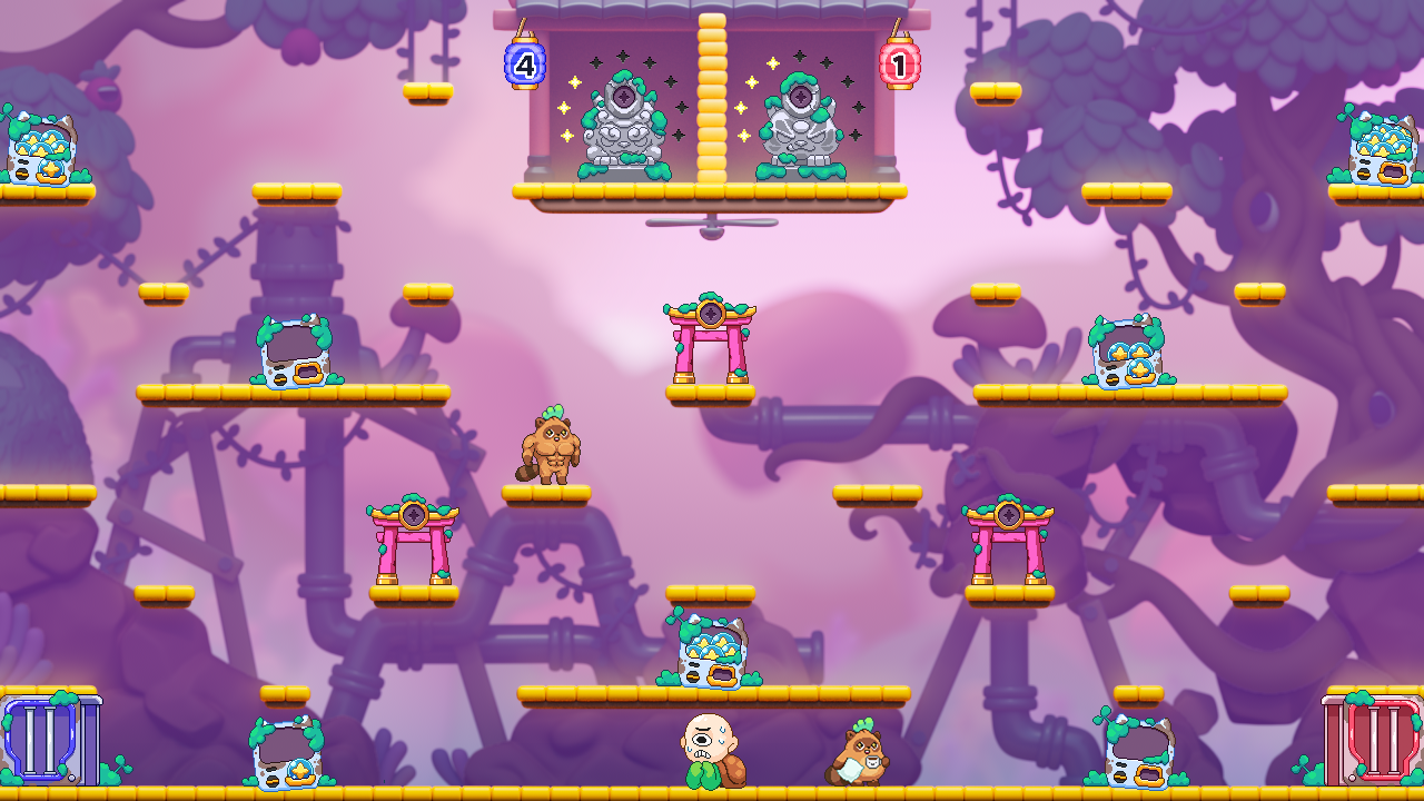 Our Head of Games, Jyro, brought his experience from working on Killer Queen, and landed on a platformer-style game with three ways to win: Economic, Tug-of-War, and Military. I was responsible for leading the creative vision on this. Beyond overseeing the schedule, production list, and art team, I wanted to push the boundaries of what a platform game could look like within our unique parameters.