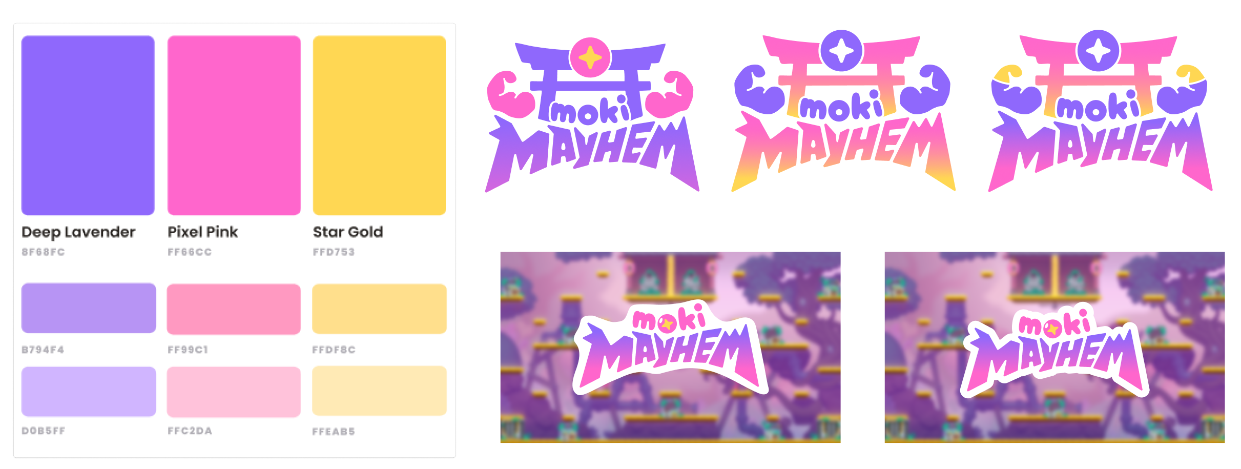 Branding: We took the guardrails established for the Grand Arena and decided that each game would use a specific sub-combination of brand colors for its own unique identity. Rachel and I worked to develop the logos and branding. We landed on a logo that was instantly readable, fun, and competitive—it felt like Moku, but with a competitive edge.